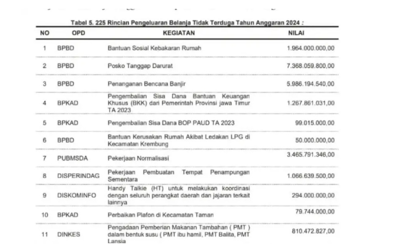 Berdasarkan dokumen keuangan, sebagian besar dana itu digunakan untuk pengadaan alat, logistik, dan perawatan fasilitas umum, bukan untuk respon tanggap darurat langsung.