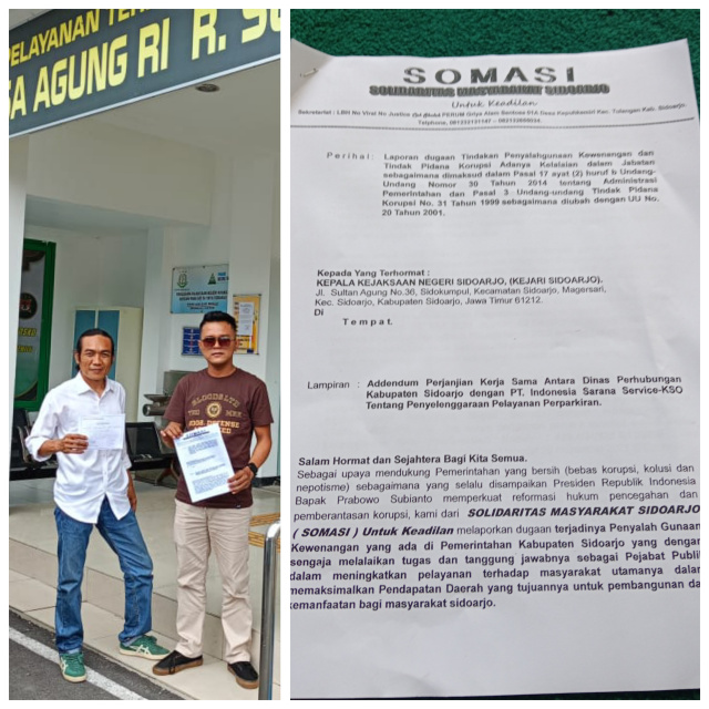 SOMASI (Solidaritas Masyarakat Masyarakat) LSM yang bergerak di bidang politik pemerintahan dan hukum, melaporkan dugaan tindakan penyalahgunaan wewenang dan tindak pidana korupsi adanya kelalaian dalam jabatan oleh Pemkab Sidoarjo.