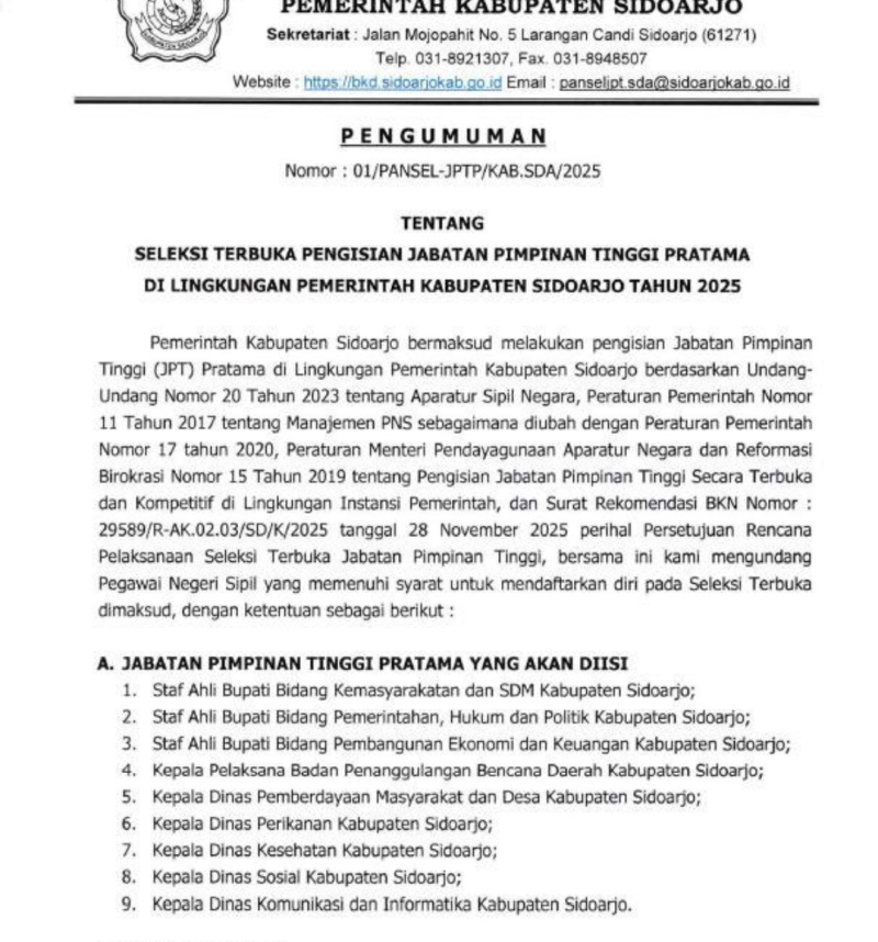 Pengumuman seleksi ini tertuang dalam surat resmi Nomor: 01/PANSEL-JPTP/KAB.SDA/2025, ditandatangani Ketua Panitia Seleksi, Prof. Dr. Seger Handoyo pada 1 Desember 2025.