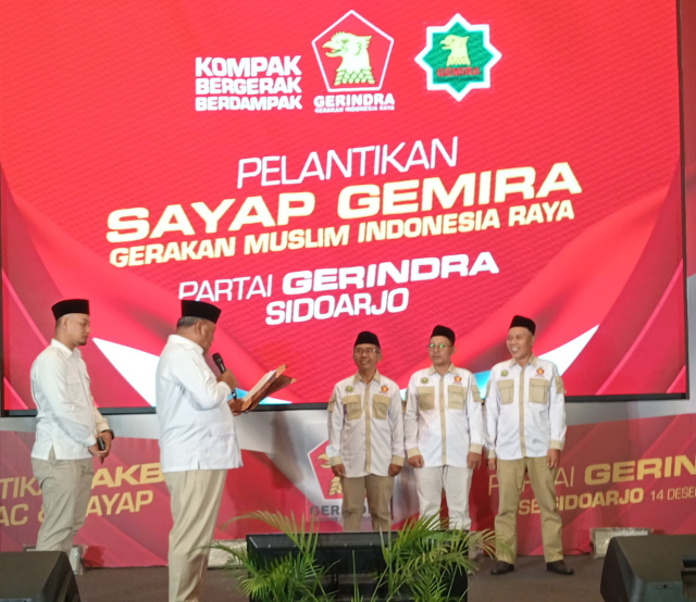 Ketua DPD Partai Gerindra Jatim Anwar Sadad dan Ketua Dewan Pimpinan Cabang (DPC) Partai Gerakan Indonesia Raya (Gerindra) Kabupaten Sidoarjo Hj Mimik Idayana, melantik pengurus Pimpinan Anak Cabang (PAC) Partai Gerindra se-Kabupaten Sidoarjo di Fave Hotel, Minggu (14/12/2025).