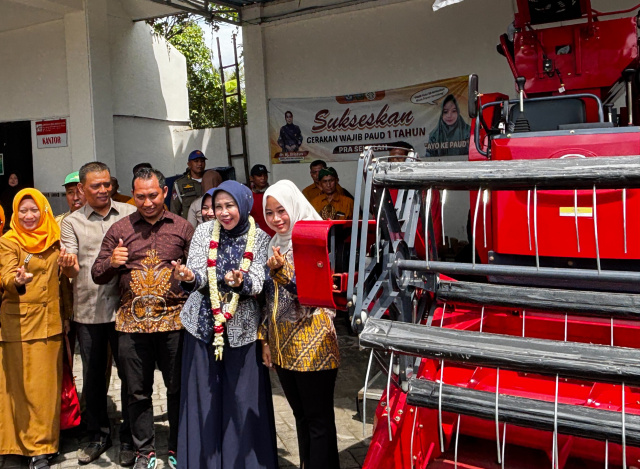 Wakil Bupati Sidoarjo, Hj. Mimik Idayana, menyerahkan bantuan Alat dan Mesin Pertanian (Alsintan) berupa mesin combi kepada gabungan kelompok tani di Desa Tarik, Kecamatan Tarik, Kabupaten Sidoarjo.