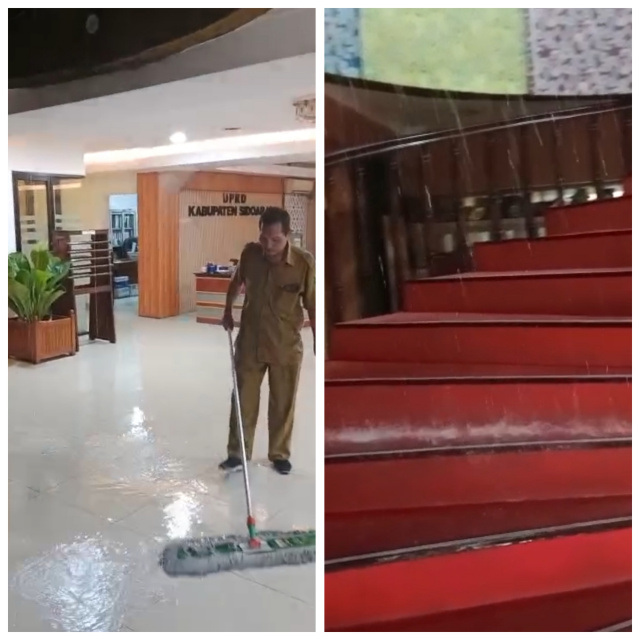 Video tersebut memperlihatkan genangan air yang masuk ke dalam gedung utama DPRD Sidoarjo, bahkan tampak mengalir di beberapa bagian lorong.