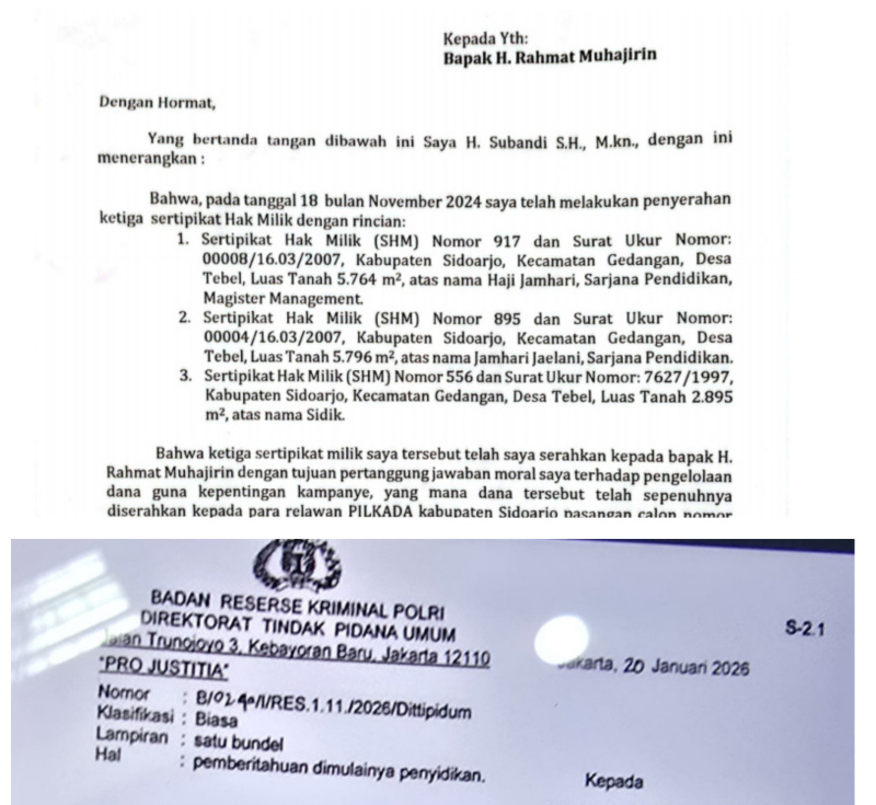 Disaat proses penyidikan kasus dugaan Penipuan dan penggelapan dana sebesar Rp 28 miliar terus bergulir di Mabes Polri, tiba-tiba Subandi SH Bupati Sidoarjo, mengirimkan surat teguran yang ditujukan kepada H.Rahmat Muhajirin terkait penyerahan tiga sertifikat tanah pada 27 Januari 2025.