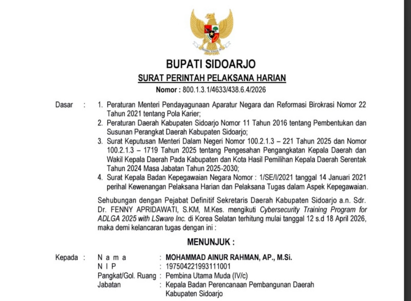 Dalam dokumen internal Pemerintah Kabupaten Sidoarjo tertanggal 11 April 2026, didapati penunjukan Pelaksana Harian (Plh) Sekretaris Daerah Kabupaten Sidoarjo kepada Ainur .
